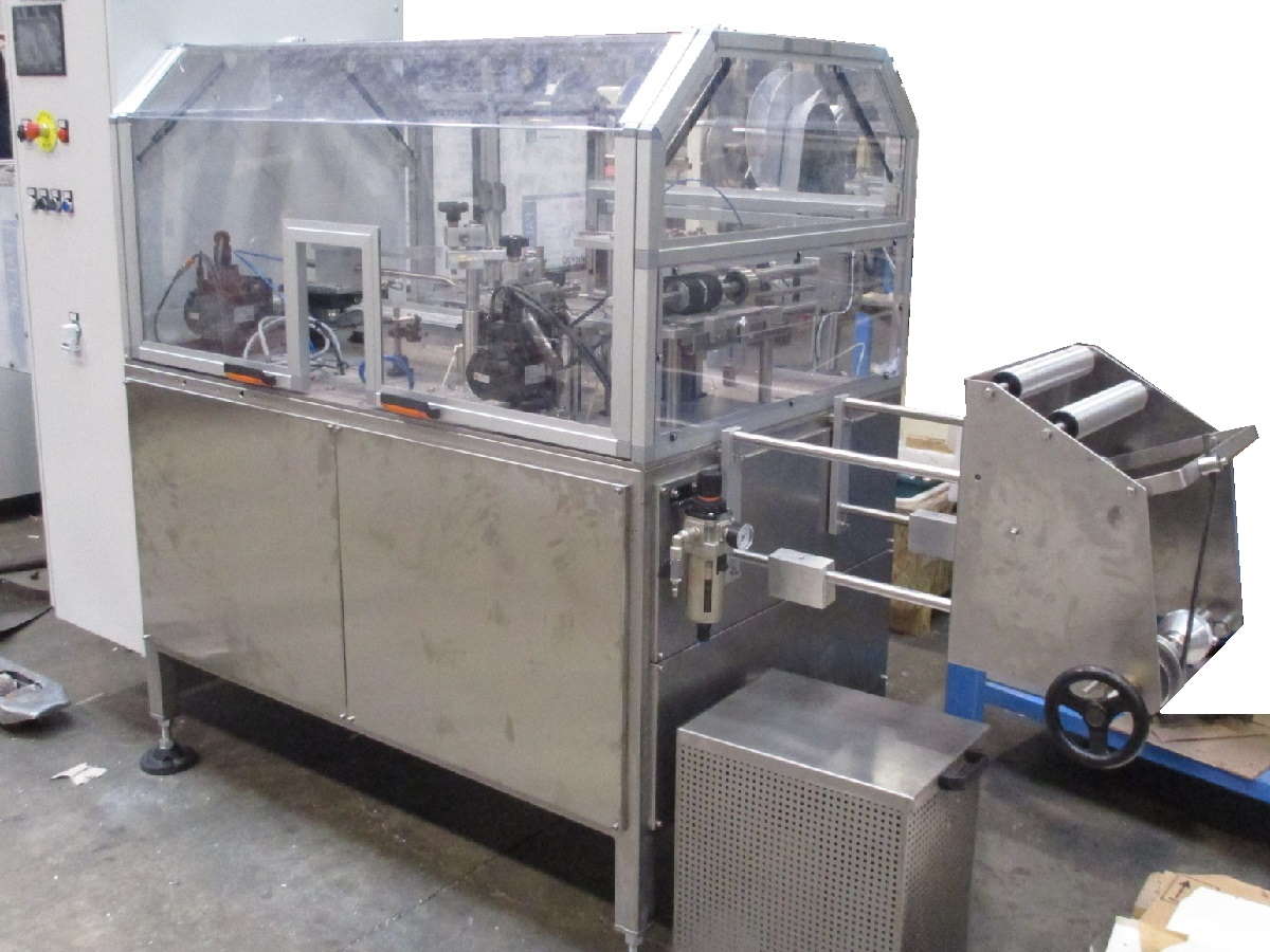 - A cam driven vacuum suction cup arm transfers the product from the infeed conveyor into the roil fed wrapping material which was cut into an octagonal shape. The product together with its wrapping material is lowered into a pleating head assembly group, where twenty four pleats are formed. The excess wrapping material Is cui off and discharged with a vacuum system into a net bag.