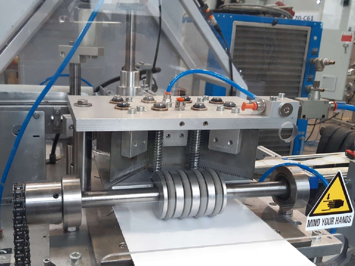 - The pleat wrapped and labelled products are discharged into a continuous motion discharge conveyor.