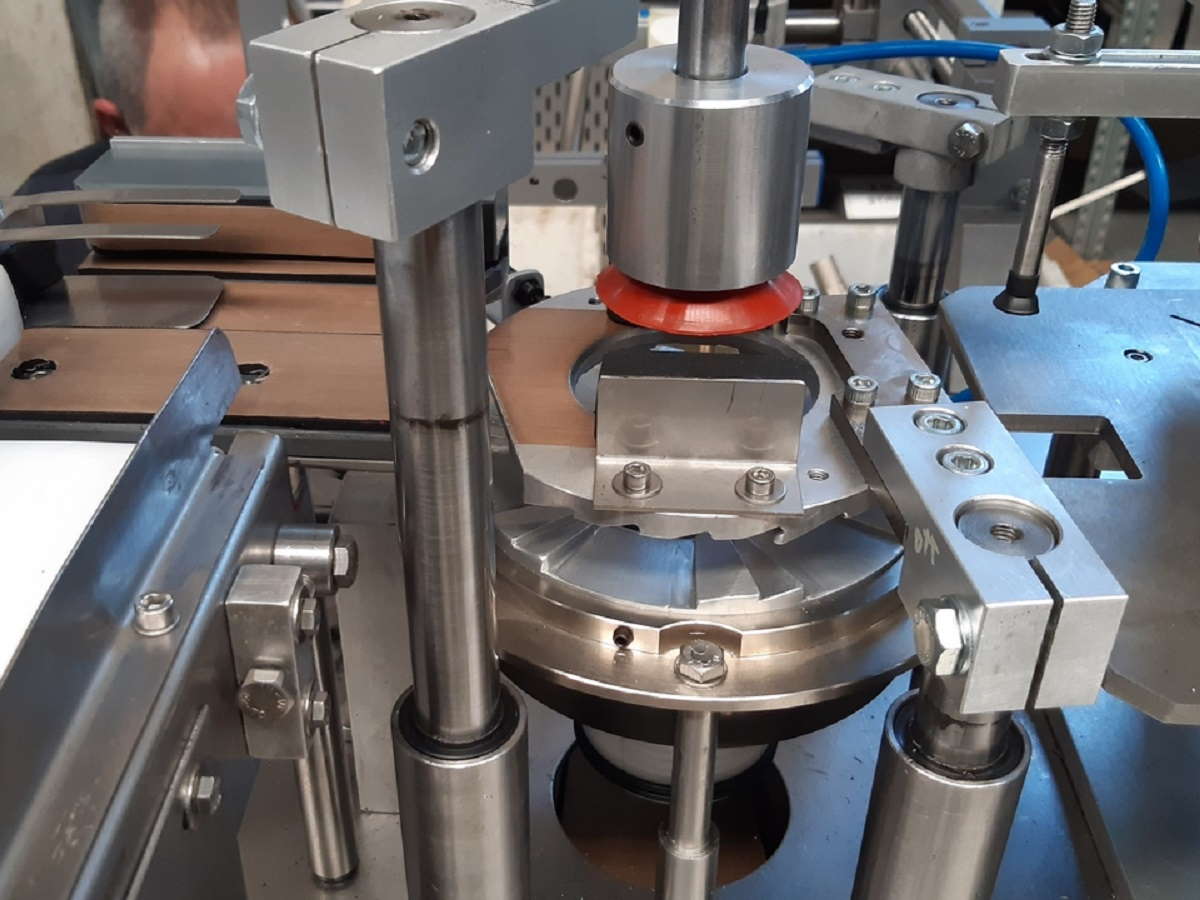 - The folded pleats are securely maintained by a mechanically controlled iris system as the pleating head with the product inside moves to the labelling station, where the label is applied.