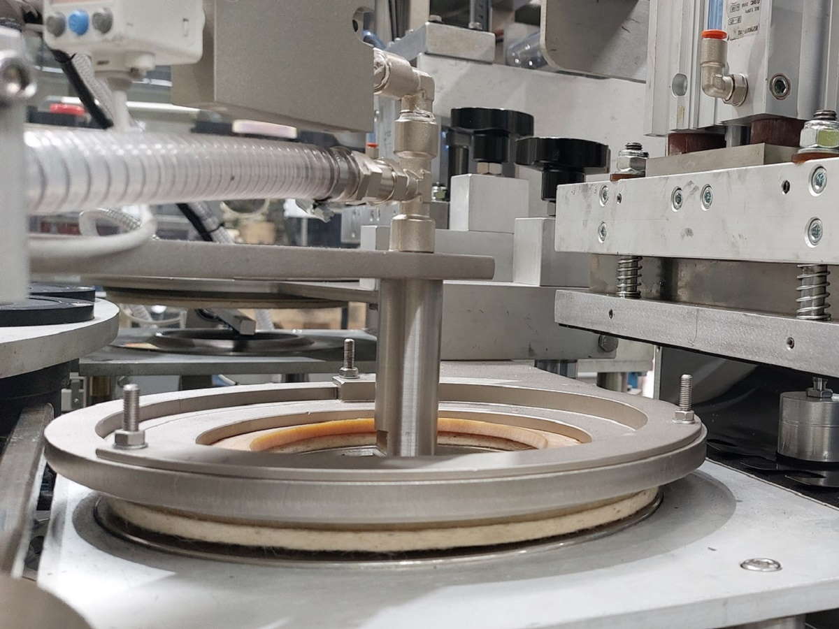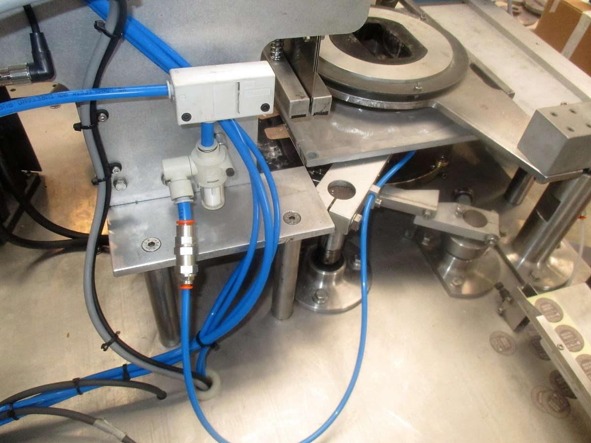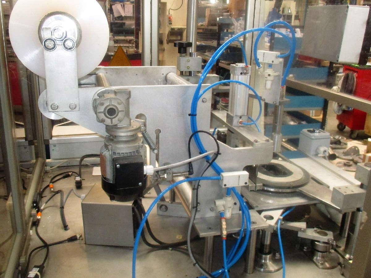- A cam driven arm places a roll fed self-adhesive label on top of each product.