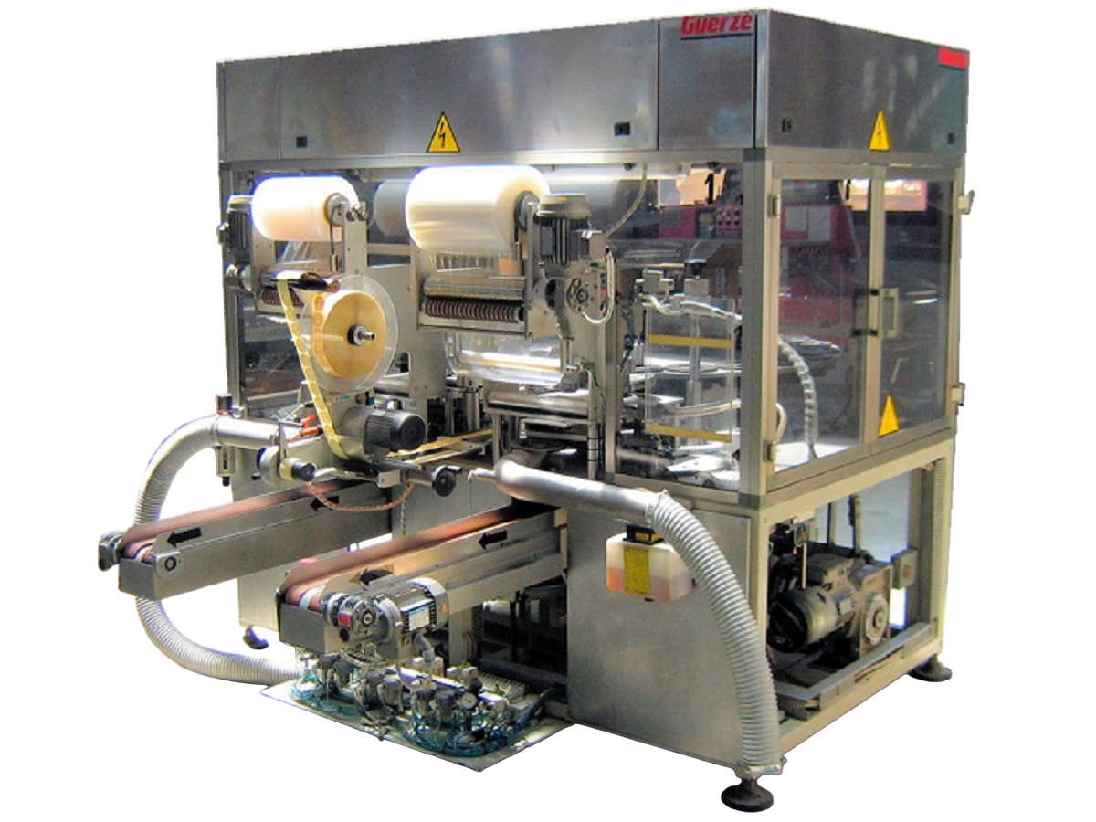 - The film is pre-stretched as the product together with the film is lowered into the wrapping head assembly.