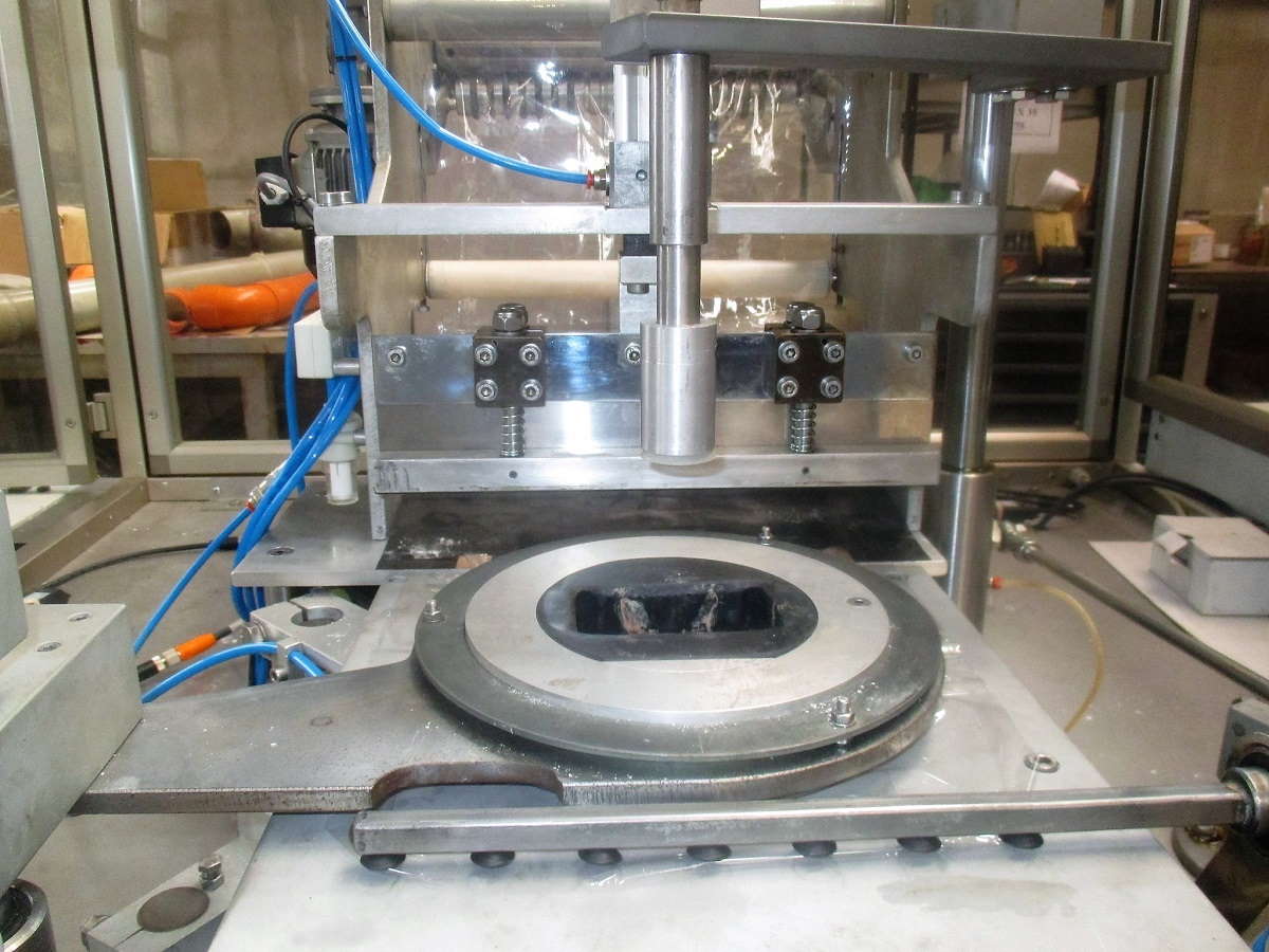 - A hot knife cuts off the excess film and seals it. Two mechanical fingers remove and discard the film through a discharge tube into an excess film collecting container.